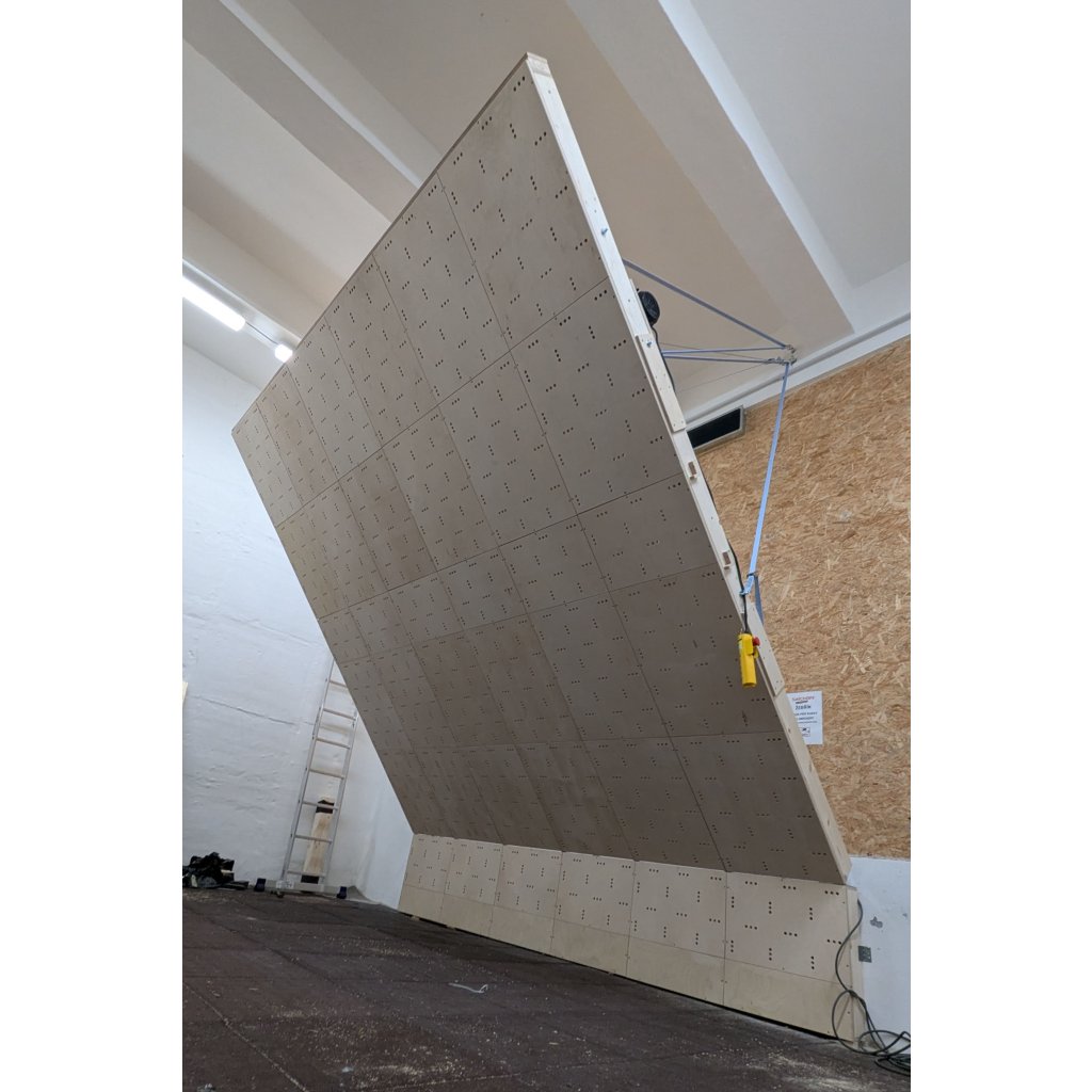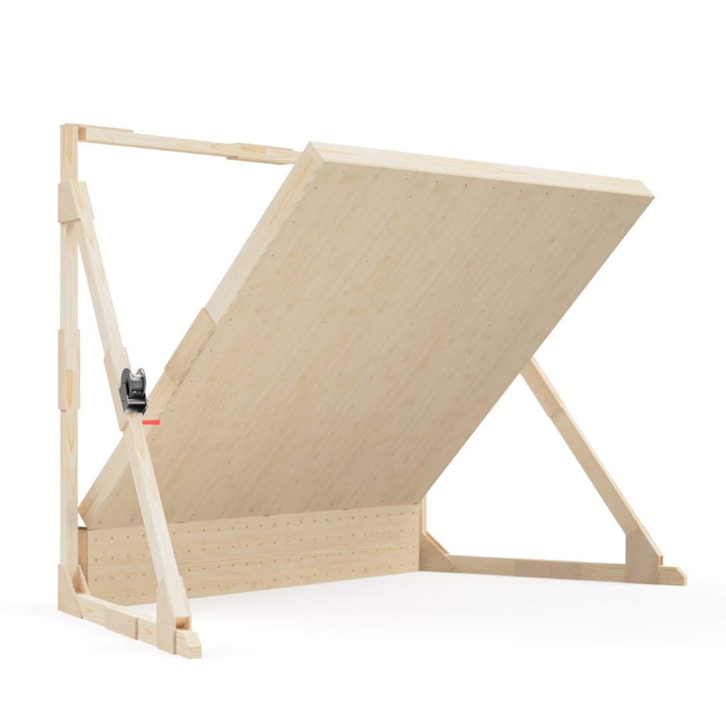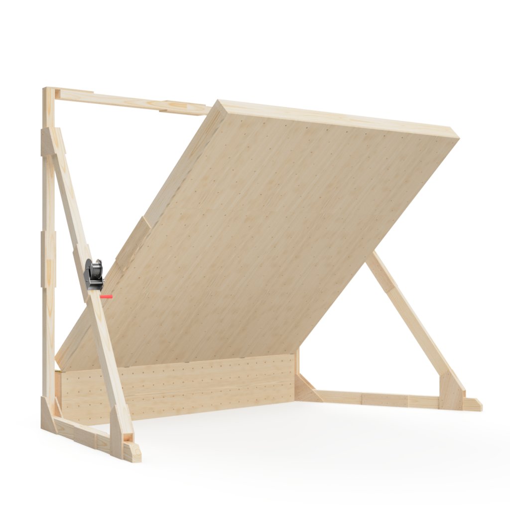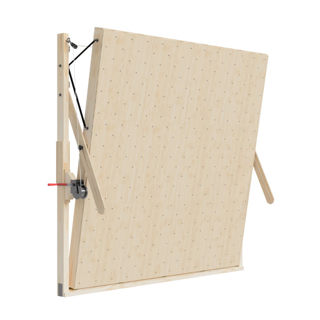 Naklápění se provádí pomocí ručního nebo elektrického navijáku, umístěného na levé nebo pravé straně stěny (dle tvých preferencí). Stěnu drží na místě kromě navijáku i pojistné dyneemové popruhy na každé straně a aretační vzpěry s drážkou a šroubem (podle vzpěry můžeš snadno nastavit sklon stěny a nemusíš tak nic extra vyměřovat – prostě koukneš a vidíš). Tento tříbodový systém zajišťuje vysokou bezpečnost stěny a zabraňuje pohybu hlavní desky směrem ode zdi a ke zdi. Prostě stěna drží jako přibitá v jakékoliv poloze.
